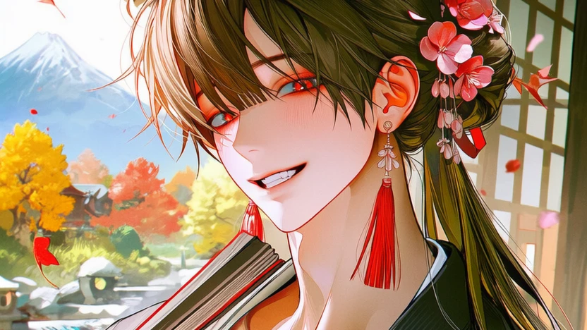 A beautiful man with long, glossy brown hair tied with a red cherry blossom ornament.