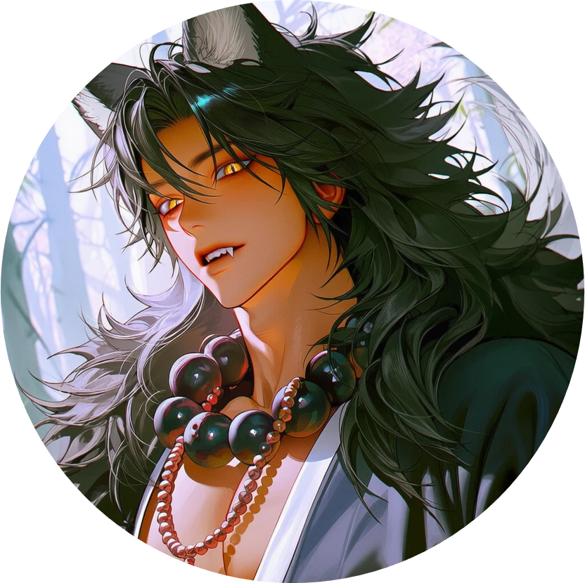 A muscular man in his early 30s with beast-like eyes, messy black hair, wolf ears, and thick prayer beads. Izumi made him the master of the mountain when he had nowhere to go, and he repays this favor by often helping with shrine affairs. He is rough and aggressive.